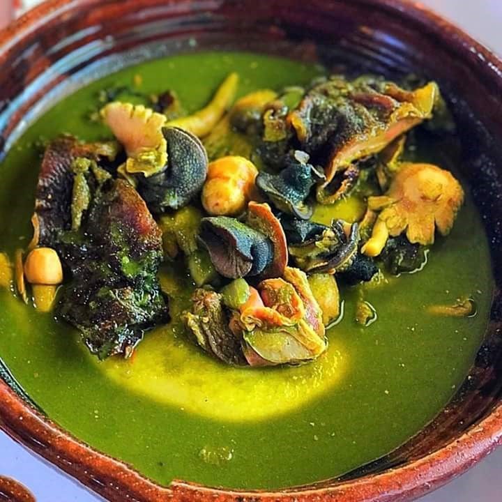 A wholesome Ghanaian soup made with fresh cocoyam leaves, tomatoes, onions, and peppers, slow-cooked with your choice of protein such as fish, meat, or snails. Nutritious and flavourful, it is sometimes enriched with groundnuts for thickness. Perfect when paired with boiled yam, plantain, or rice.
